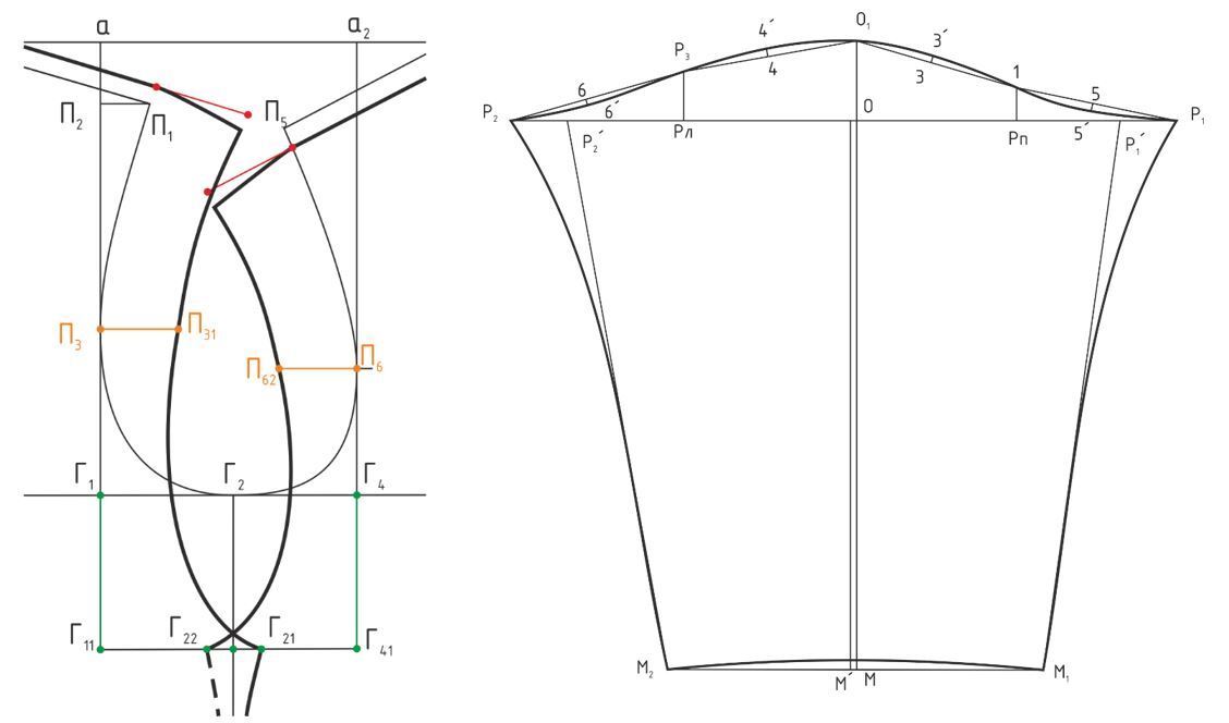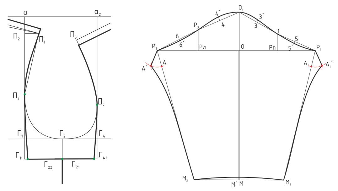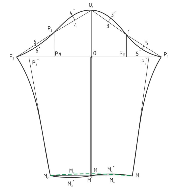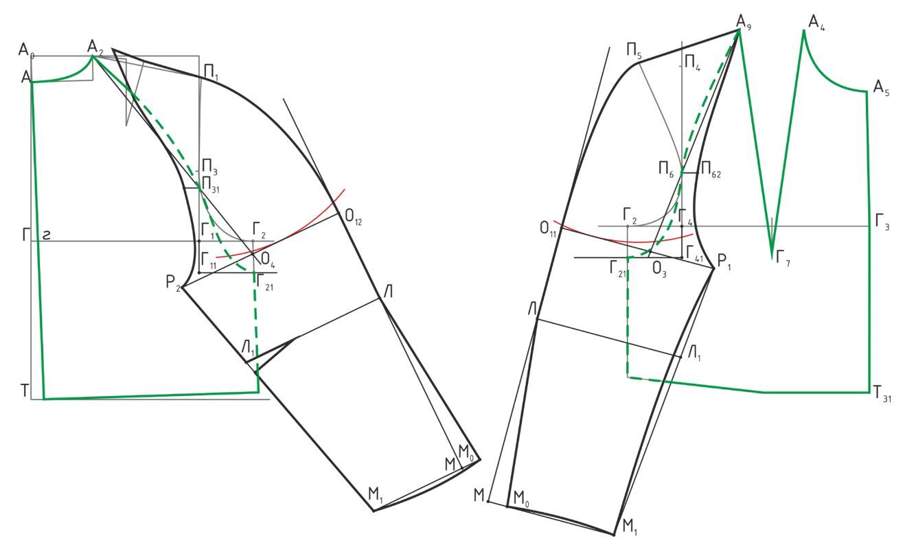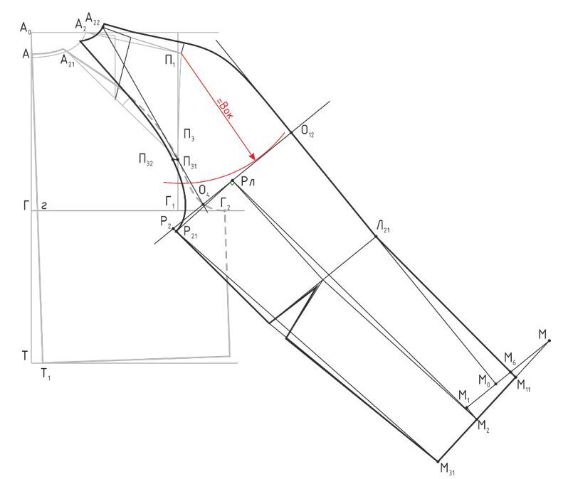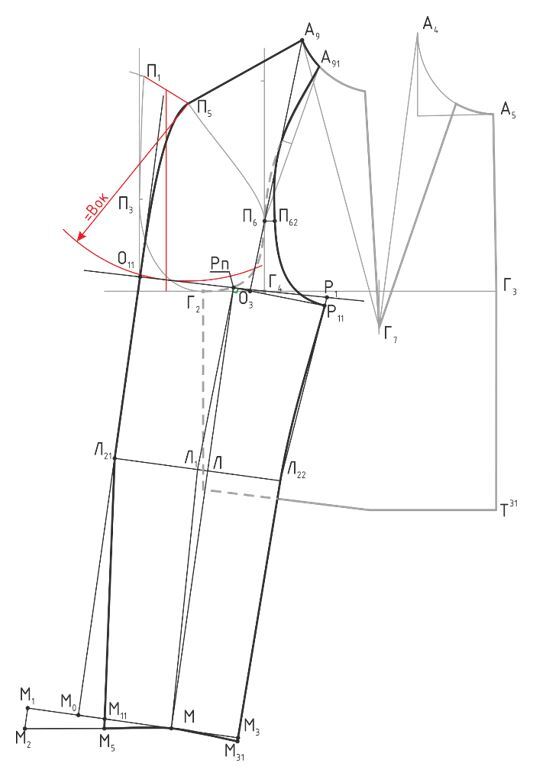 Измеряют Lпроймы спинки и Lпроймы переда без учета горизонтального отрезка Г11Г41 и откладывают из точки О1 аналогично предыдущим рукавам