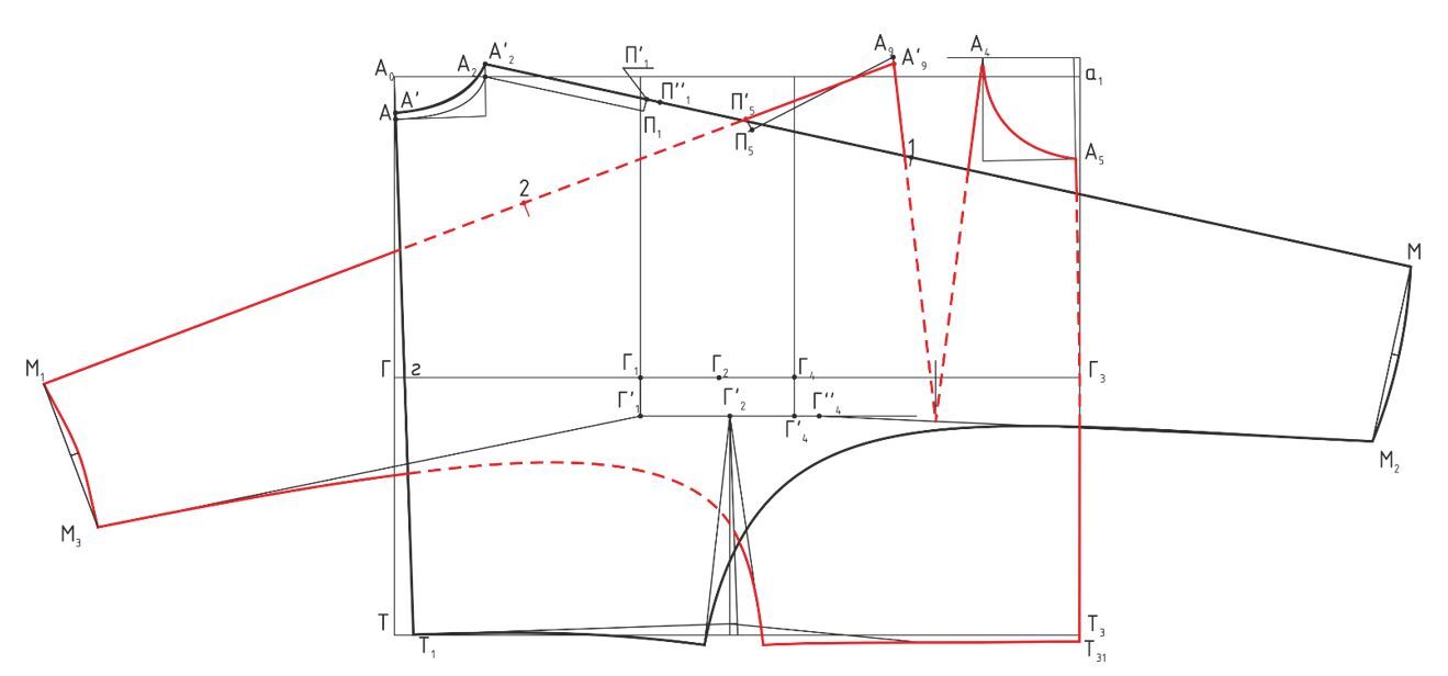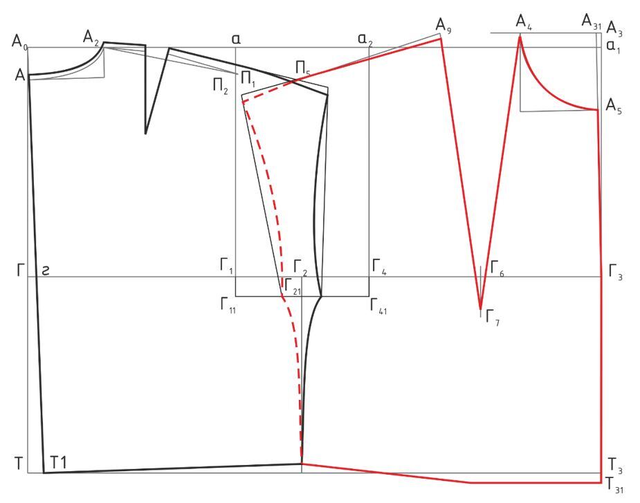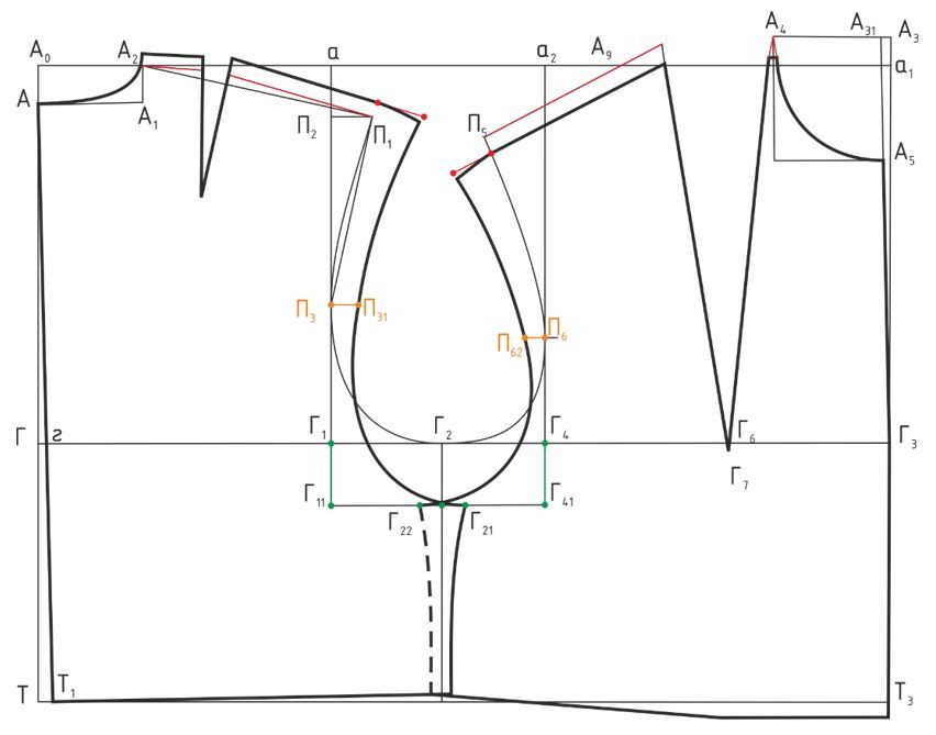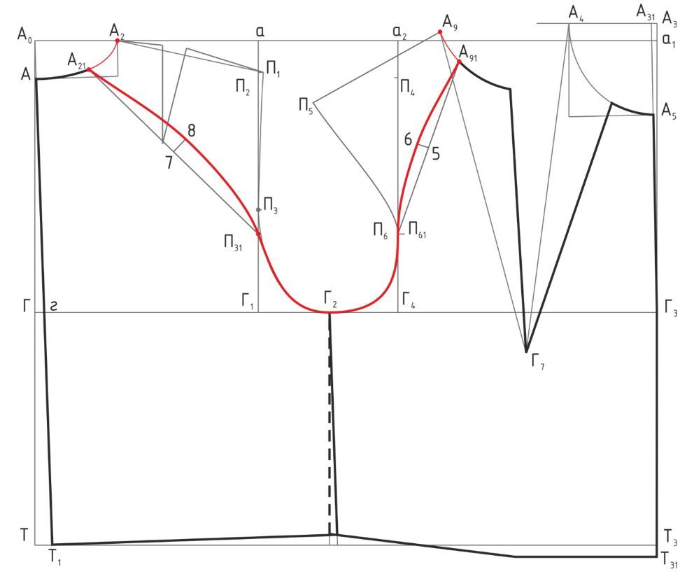 2. При построении контуров переда нагрудная вытачка уменьшается на 2-4см или вовсе не строится; 3. Осуществляется перевод плечевой линии в сторону переда (т.е. 1см снимается по переду и добавляется по спинке); 4. При оформлении проймы в точках П3 и П6 выводится папоротка; 5. В нижней части проймы достраиваются ластовицы для удобства движения.