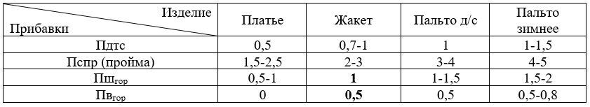 Декоративно-конструктивная прибавка даётся для объёма силуэта. Это величина зависит от направления моды, от особенностей телосложения, от модели изделия.