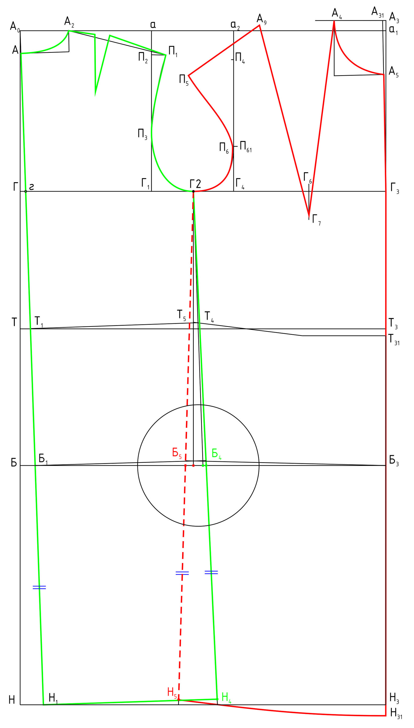 2.2 При наличии модельного расширения по низу: относительно оси на линии низа влево и вправо откладывается расширение (как правило оно меньше на 1...2см, чем модельное расширение в боковой линии)
