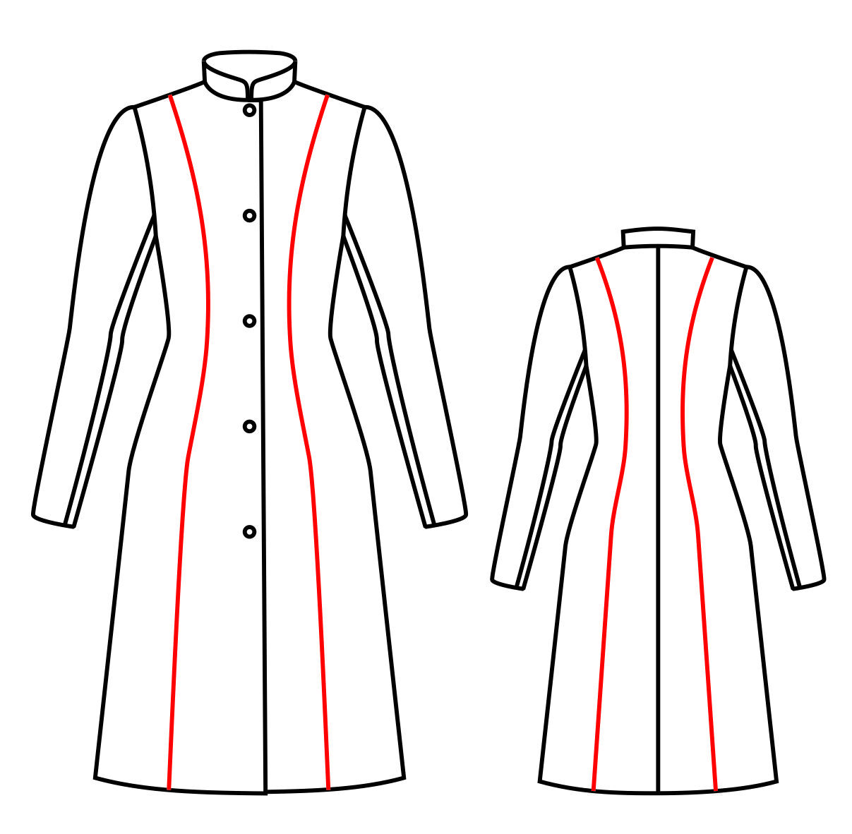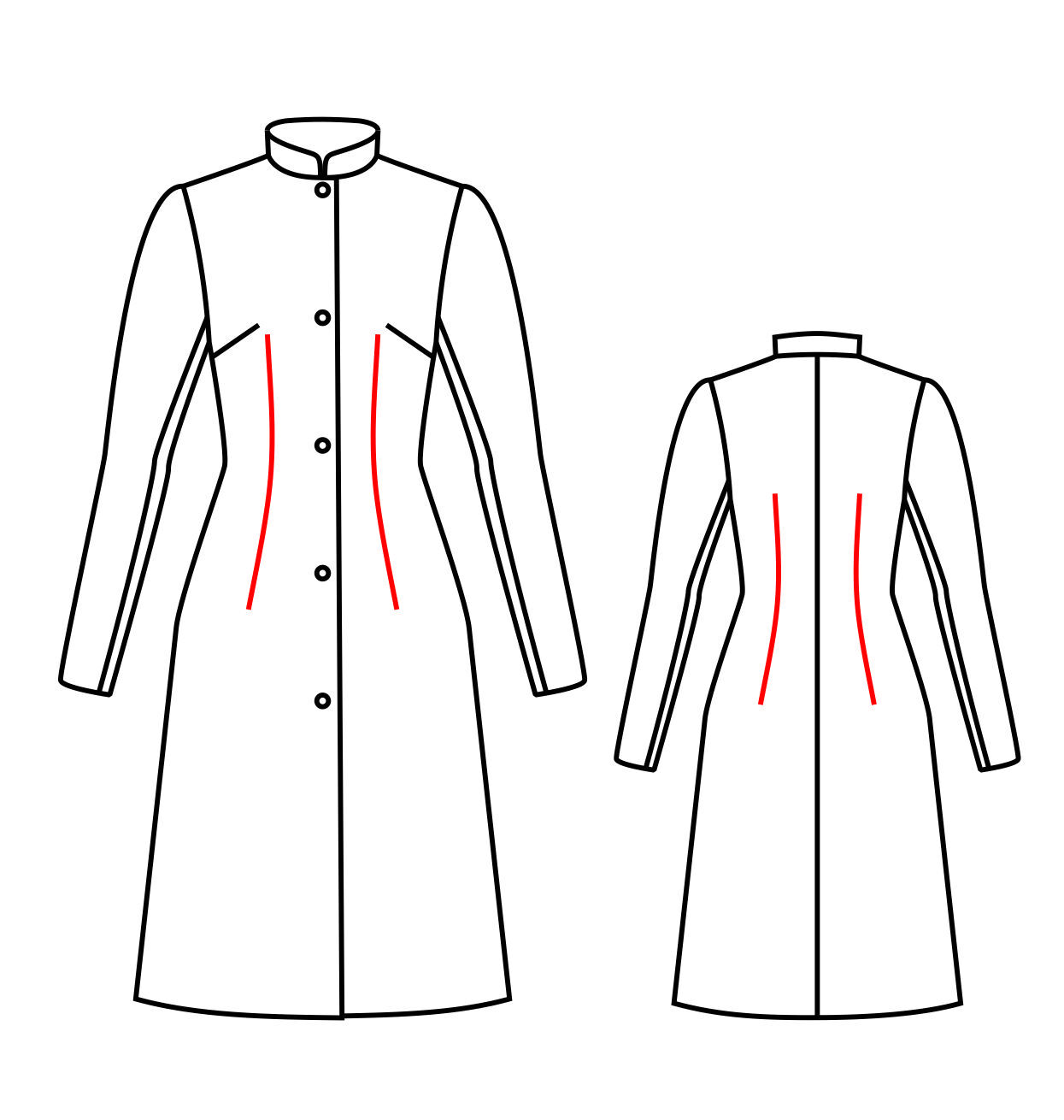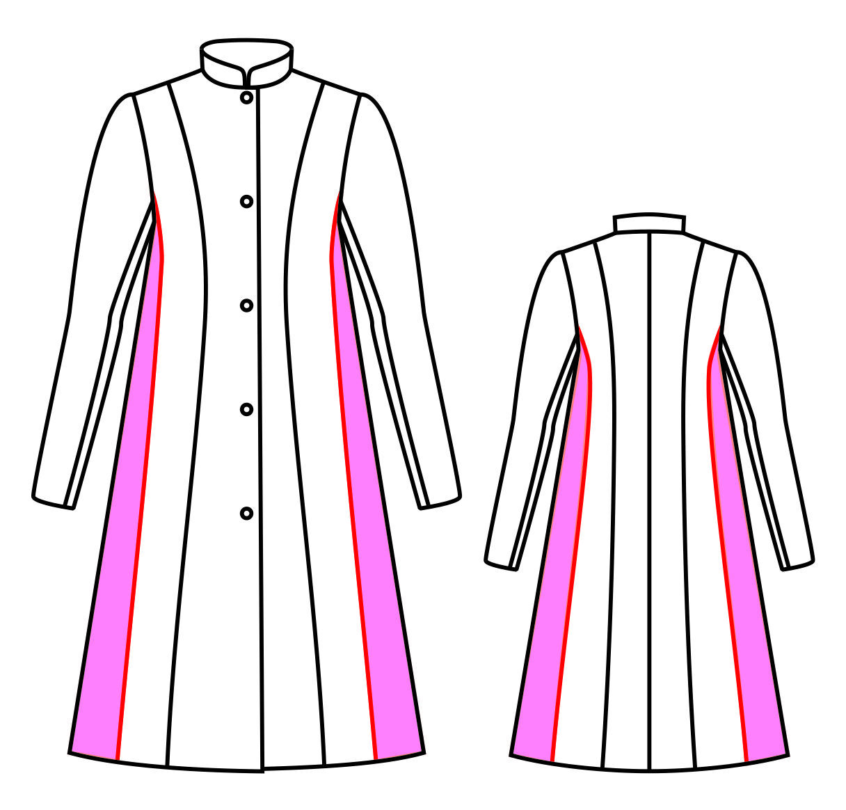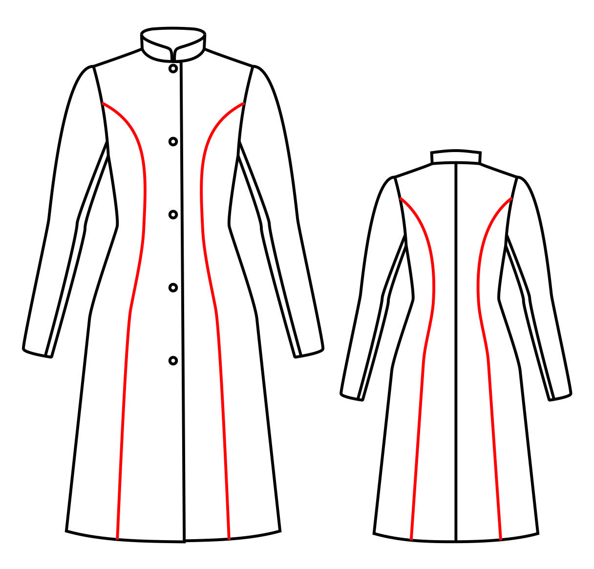 Рельефы проходят через талиевые вытачки, через плечевую вытачку на спинке и нагрудную – на переде.