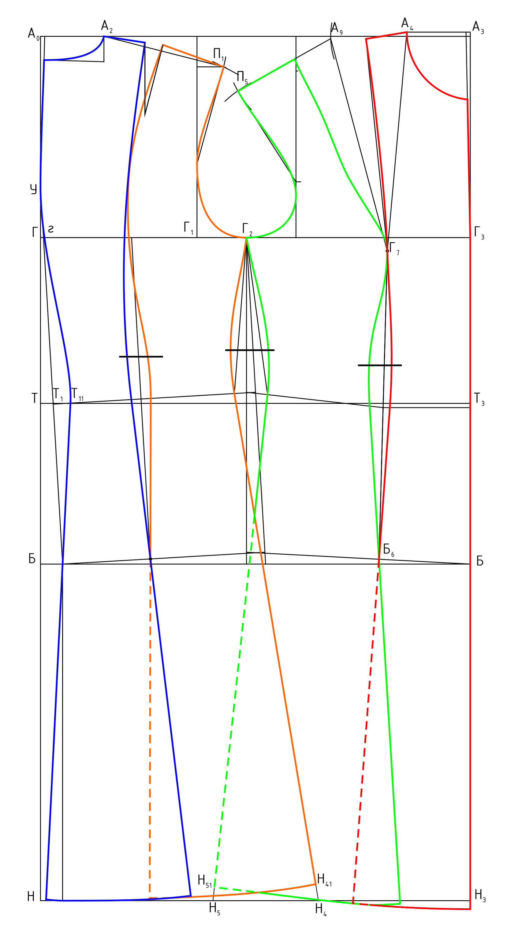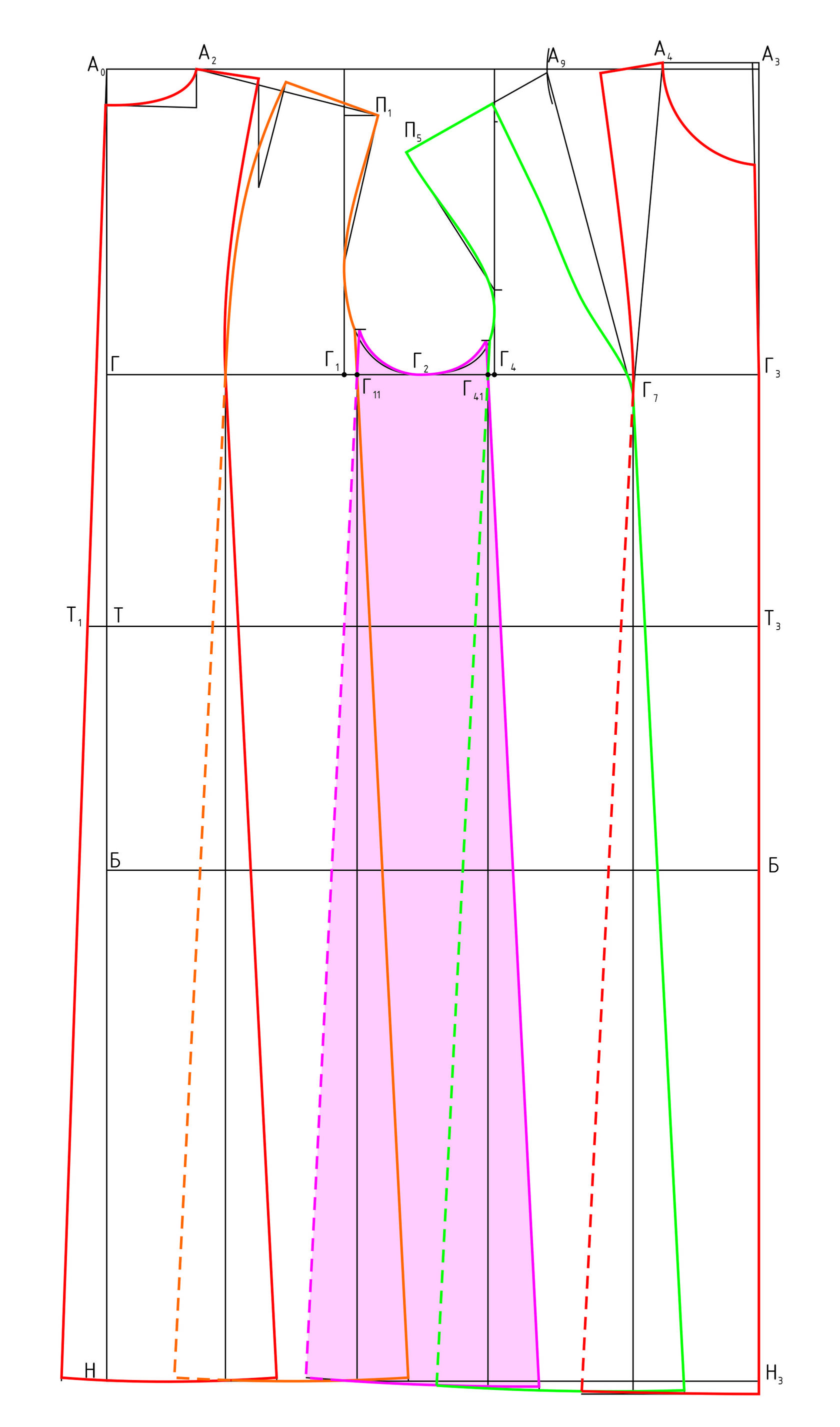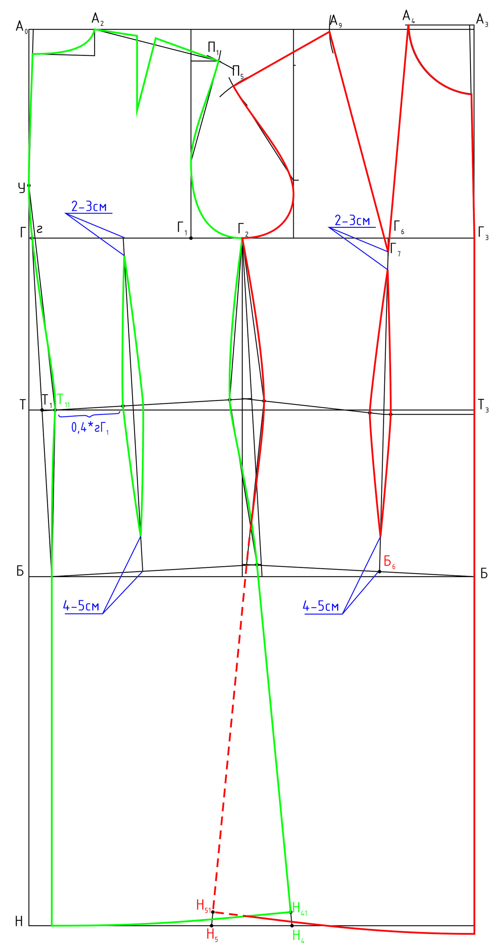До начала построения рельефных линий должны быть построены линии низов изделия и на спинке, и на переде.