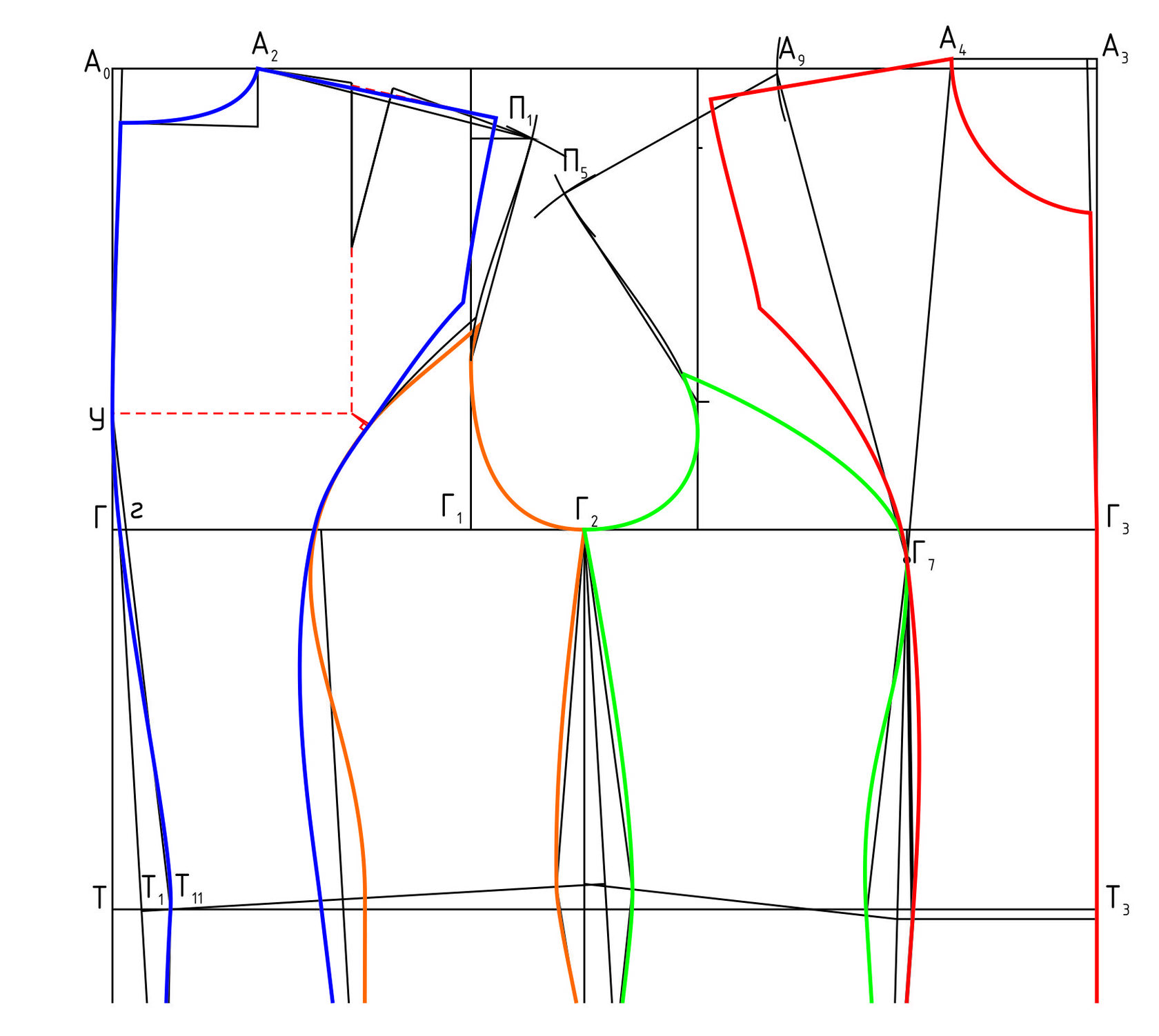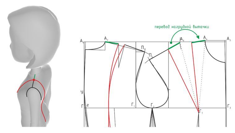 На линии плеча рельеф спинки совпадает с рельефом переда, для этого плечевую вытачку сразу строят на необходимом расстоянии от точки А2 или переводят в нужное место, нагрудную вытачку переводят в плечо.